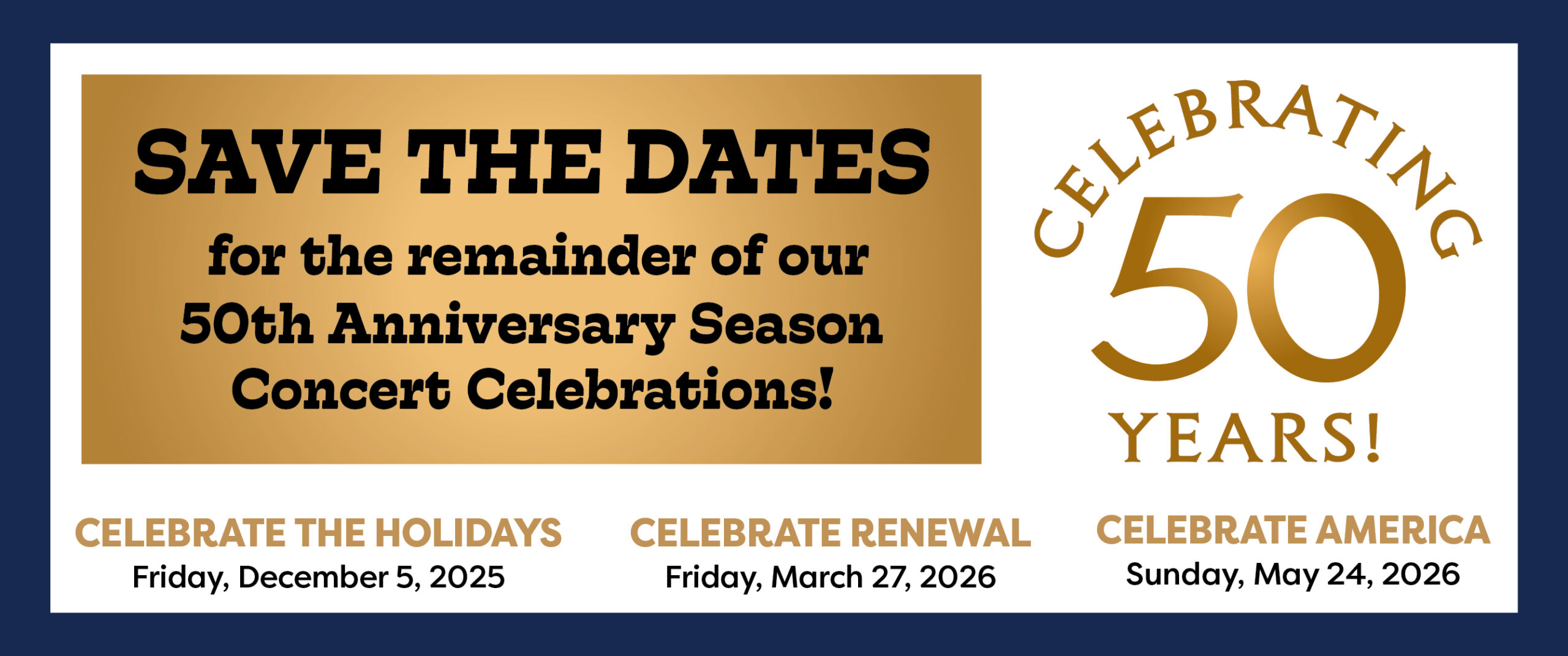 This milestone season will feature special concerts, guest artists, and cherished favorites. Check out our Concerts & Special Events page for all the details, and mark your calendars to be a part of the music and the memories as we honor our past and sing into the future.